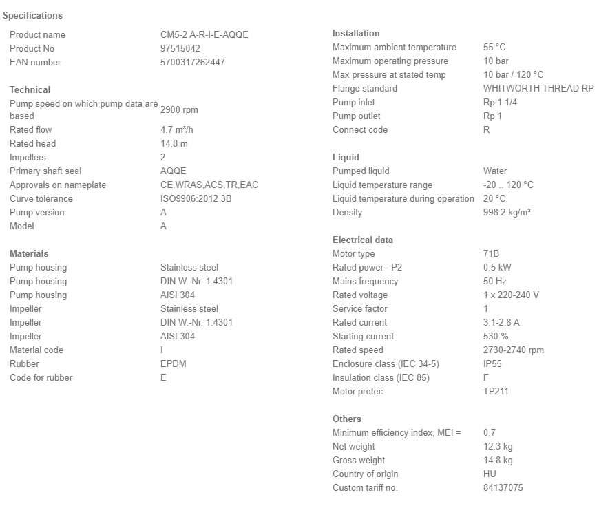 Grundfos CM-I pumps are made from 304 Stainless Steel (EN1.4301). CM5 pumps have 1 1/4" BSPF Suction and 1" BSPF Discharge pipe connections.