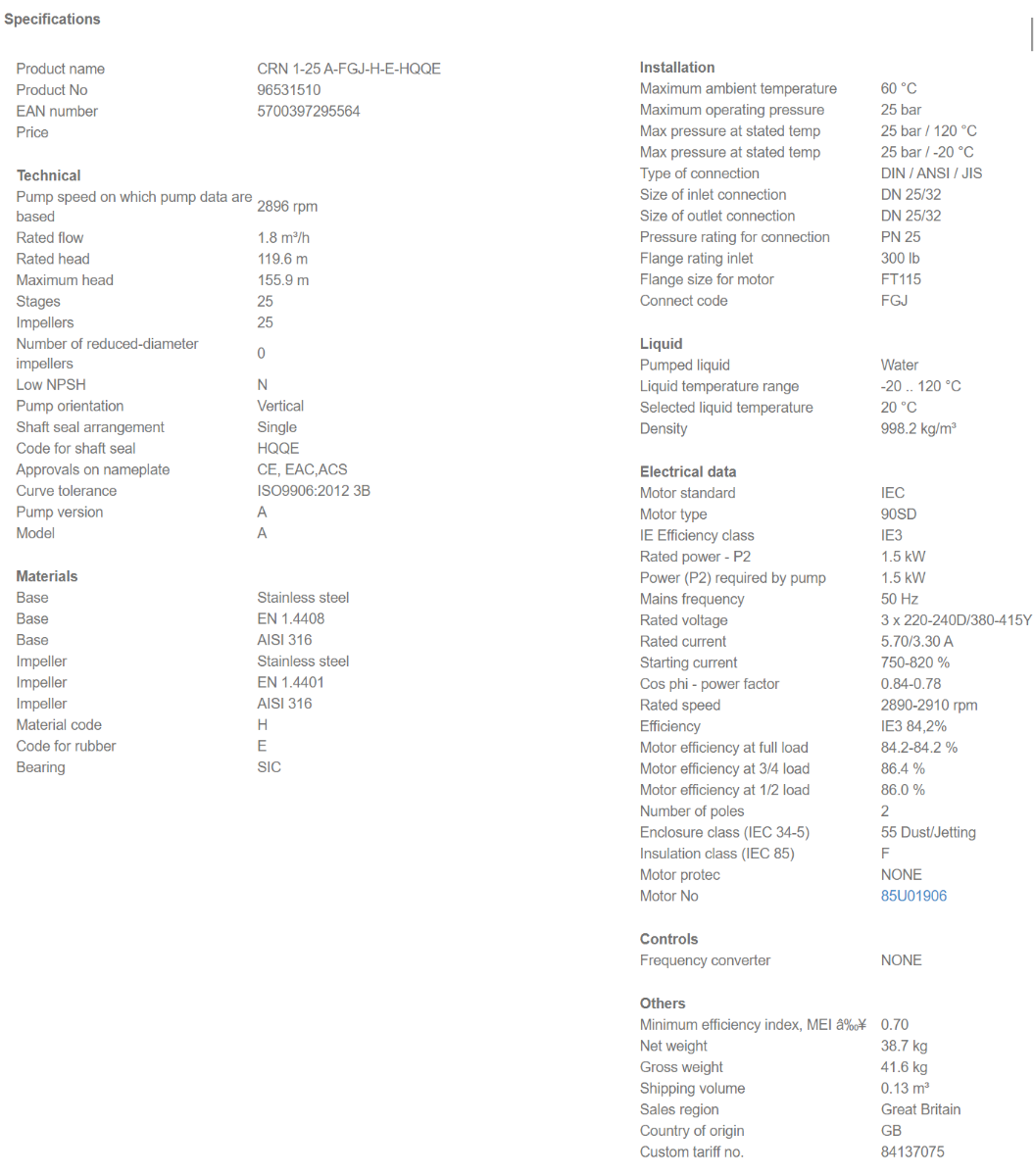 Grundfos CRN 1-25 A FGJ H E HQQE 1.5kW Stainless Steel Vertical Multi-Stage Pump 415v
