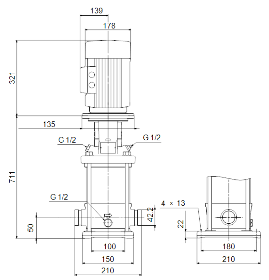 Vertical, multistage centrifugal pump with inlet and outlet ports on same the level (inline).