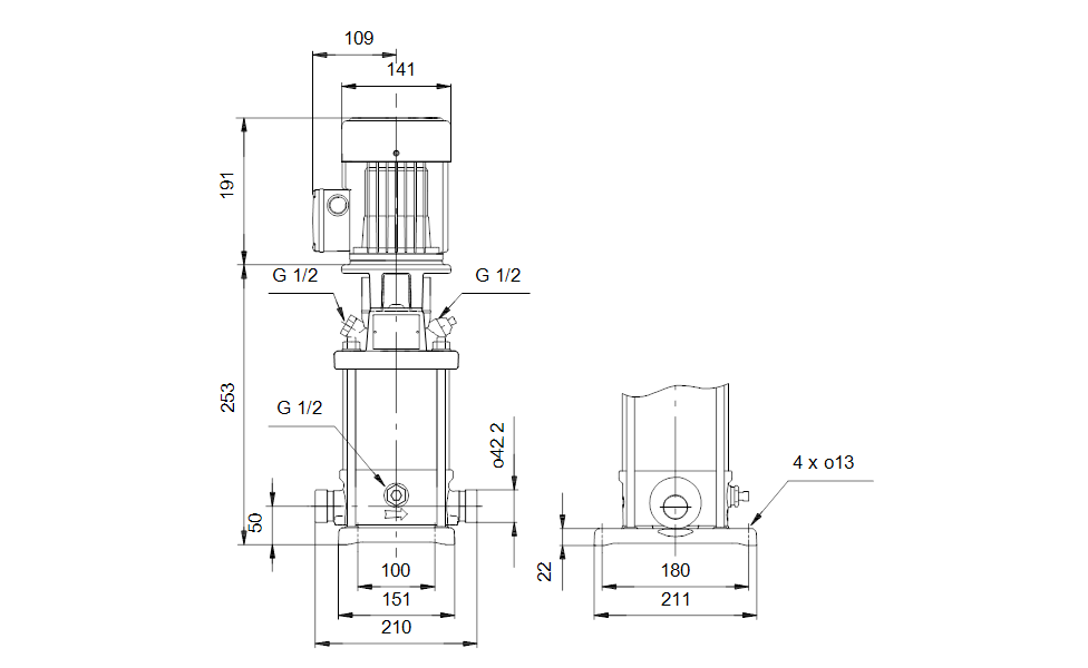 Vertical, non-self-priming, multistage, in-line, centrifugal pump for installation in pipe systems and mounting on a foundation.