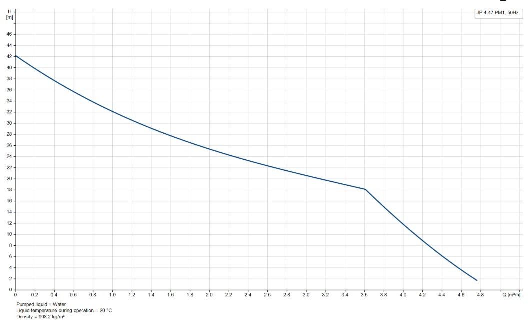 Grundfos JP 4-47 PM1 booster consists of a Grundfos JP pump and a pressure manager. The JP 4-47 PM1 provides the comfort of constant water pressure with automatic start and stop matched to consumption by the intelligent pressure manager. The pressure manager starts the pump at 1.5 bar, and the pump keeps running as long as there is flow.