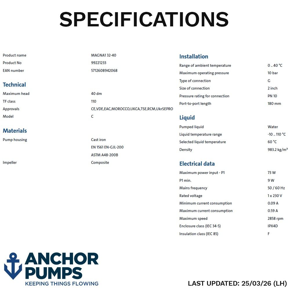 Grundfos MAGNA1 32-40 (180) 'A' Rated/EuP Ready Variable Speed Circulator 240V - 99221233