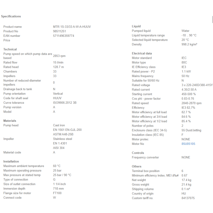 Grundfos MTR 1S 33/33 A W A HUUV 1.1kW Stainless Steel Vertical Immersible Pump 415v