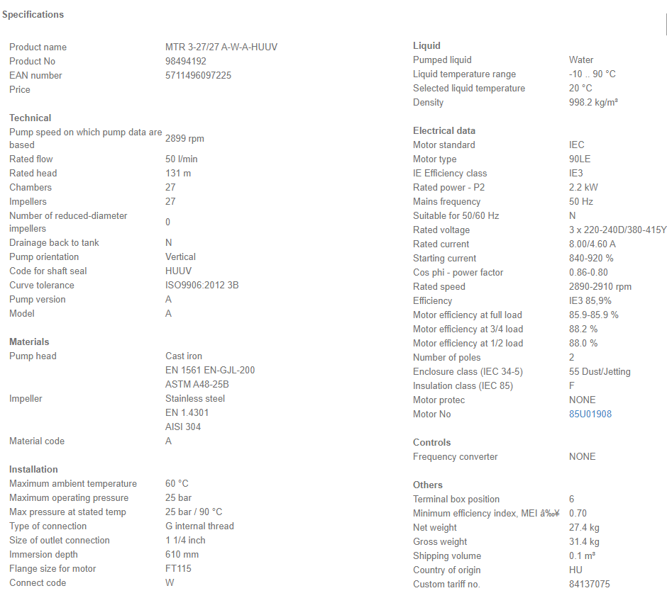 Grundfos MTR 3 27/27 A W A HUUV 2.2kW Stainless Steel Vertical Immersible Pump 415v