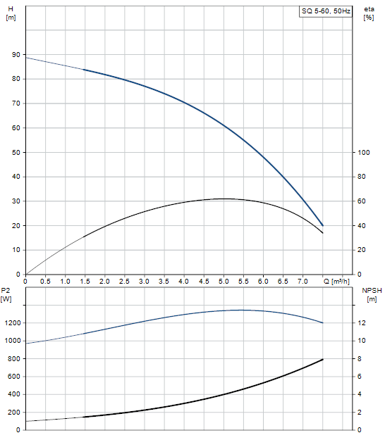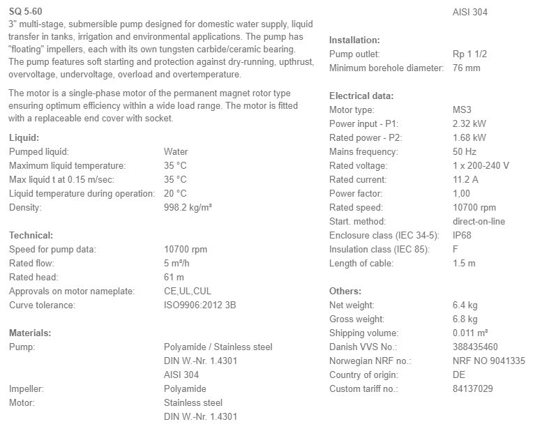 Grundfos SQ5-60 3" multi-stage submersible borehole pump with direct coupled 200-240V 1Ph 50-60Hz, 1.68kW Motor. 1.5m Cable included, please enquire for price of extra cable.