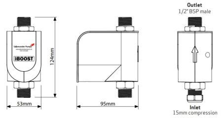- Boosts water flow to a single outlet to 7 – 12 litres per minute, depending on incoming flow.