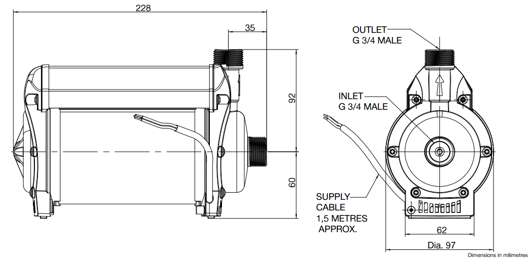 - Pump has G 3/4" male connection and G 3/4" x 15mm push-in flexible hose.