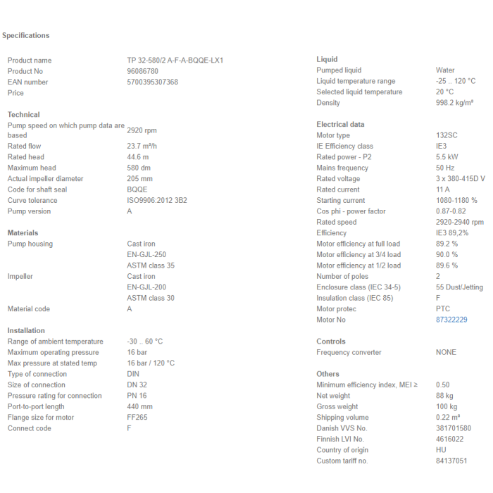 Grundfos TP 32-580/2 A F A BQQE Single Stage Single Head In-Line Pump with 2 Pole 415V 3Ph 50Hz, 5.5kW Motor and flanged connections.