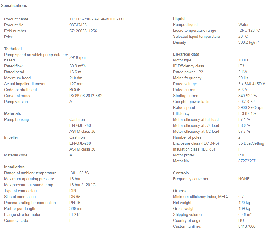 Grundfos TPD 65-210/2 A F A BQQE Single Stage Twin Head In-Line Pump with 2 Pole 415V 3Ph 50Hz, 3kW Motor and flanged pump connections.