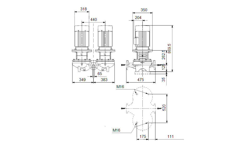 - in-line design with opposite suction and discharge ports enabling mounting in pipework or on a concrete foundation