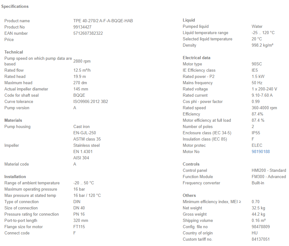 Grundfos TPE 1000 40-270/2 A F A BQQE Single Stage Single Head In-Line Pump with 2 Pole 240V 1Ph 50Hz, 1.5kW Motor and flanged pump connections.