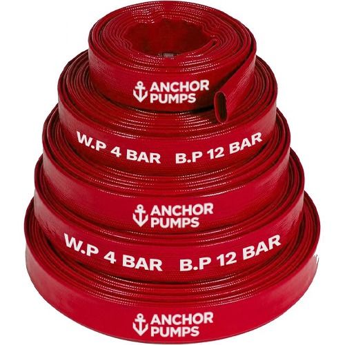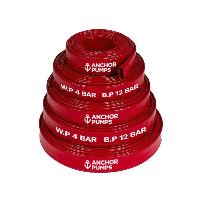 Red Layflat Delivery Hose. High pressure. Suitable for standard duty discharge of water, light chemicals and other liquids in agriculture and industry.